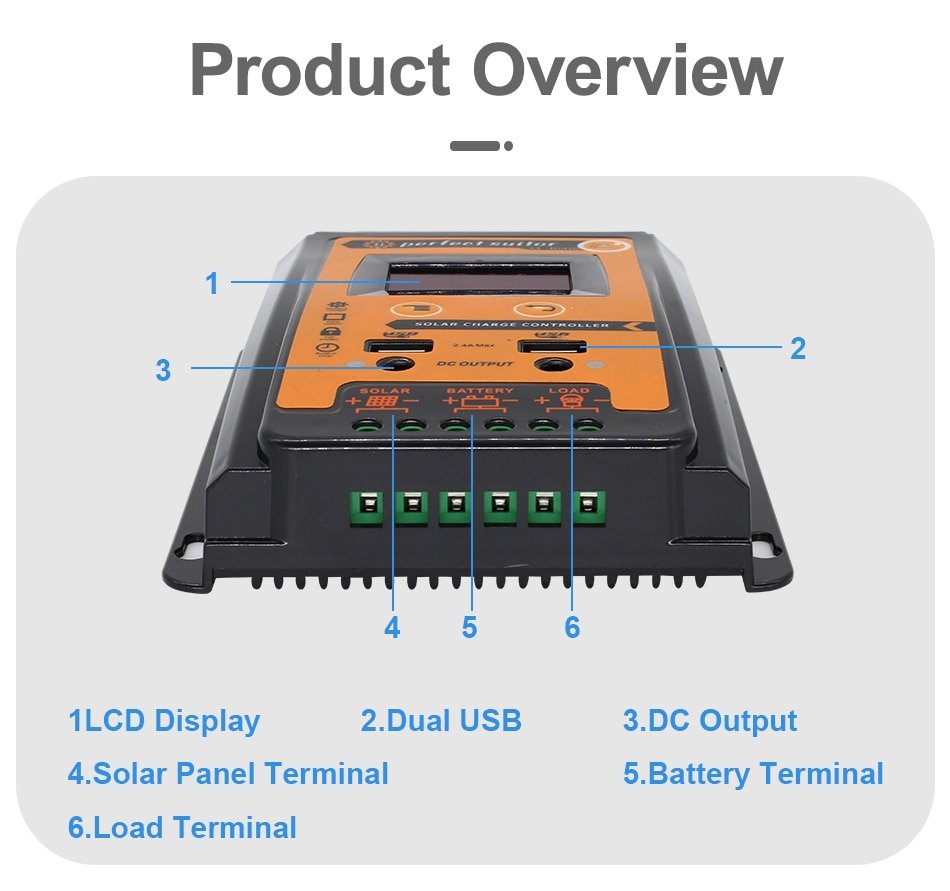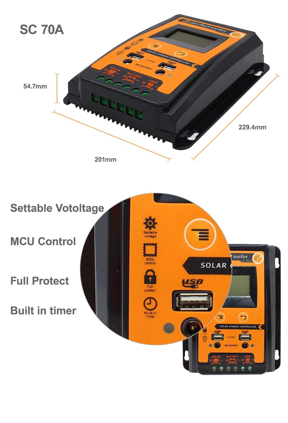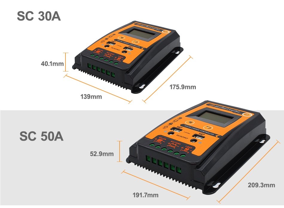 PWM Solar Charge Controller Dual USB with LCD 30A, 50A, 70A | 12V / 24V Dual USB | IP32 PV