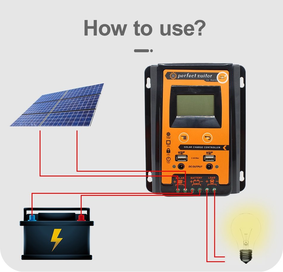 - Solar panels, battery, solar charge controller positive poles are all connected together, adopting negative MOSFET in series control circuit.
