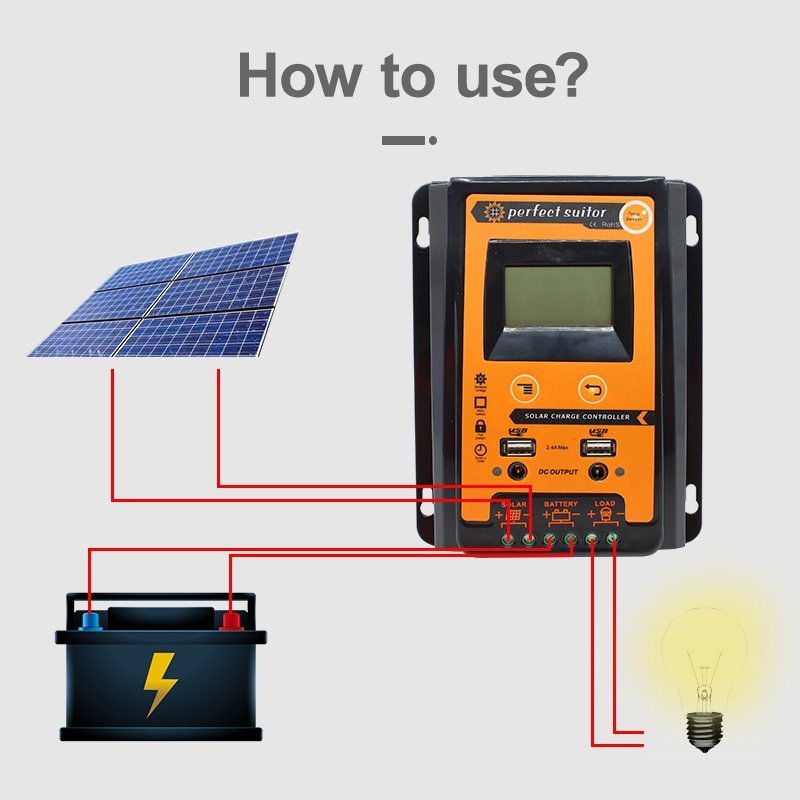 - Solar panels, battery, solar charge controller positive poles are all connected together, adopting negative MOSFET in series control circuit.