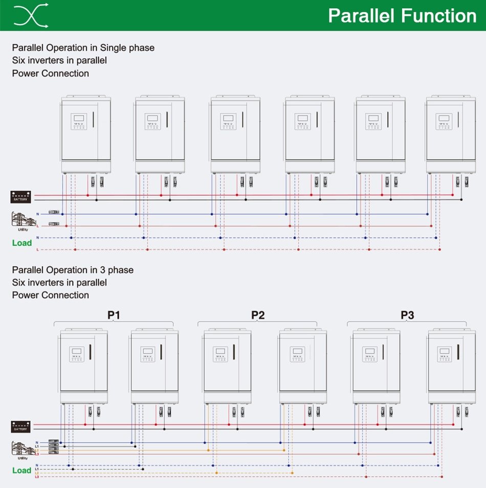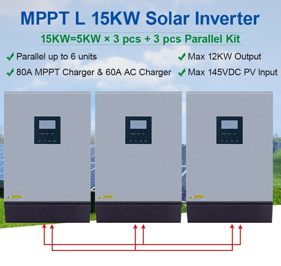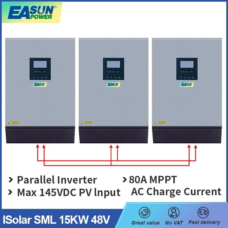 • ISolar SML 15KVA = SML 5KVA X 3 ISolar SML 15kva 48vdc ,It is Paralleled by 3 Units 5Kva Inverter with Parallel Kits is a Competitive Cost 12000W Continuous, 48Vdc Input Pure Sine Wave Inverter Charger Design with ac input /output 220-240vac single phase only. ( not Split phase 110/220vac)