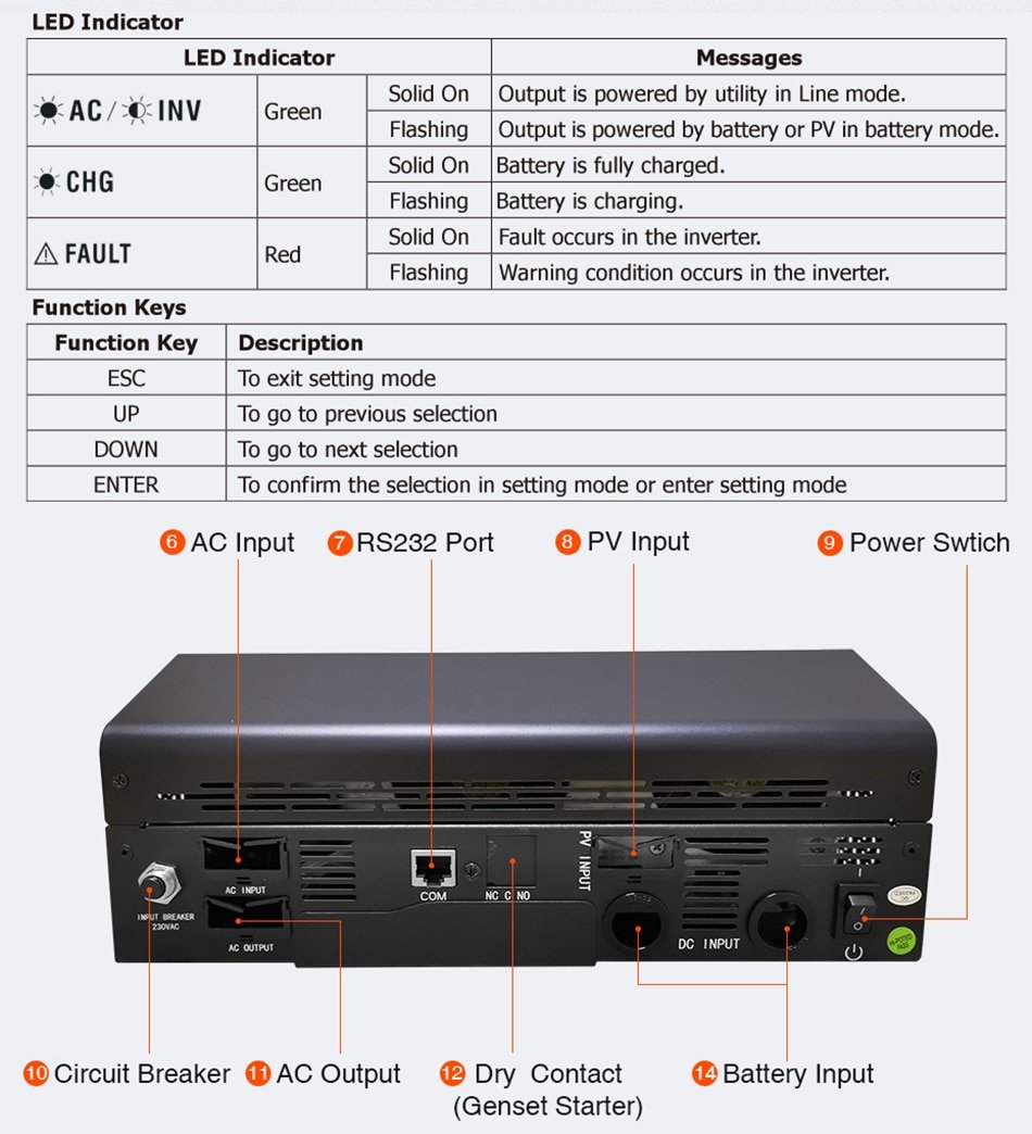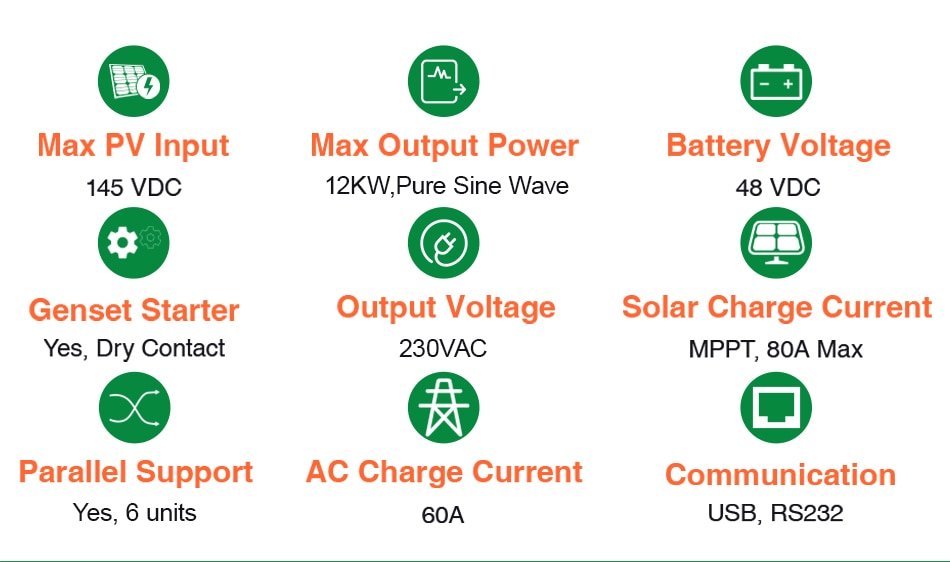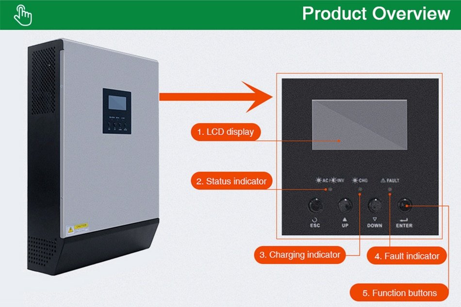 This is multi-function inverter/charger ,combining functions of inverter, MPPT solar charger and battery charger to offer uninterruptible power support with portable size .Its comprehensive LCD display offers user-configurable and easy-accessible button operation such as battery charging current .AC/Solar charger priority ,and acceptable input voltage based on different applications.