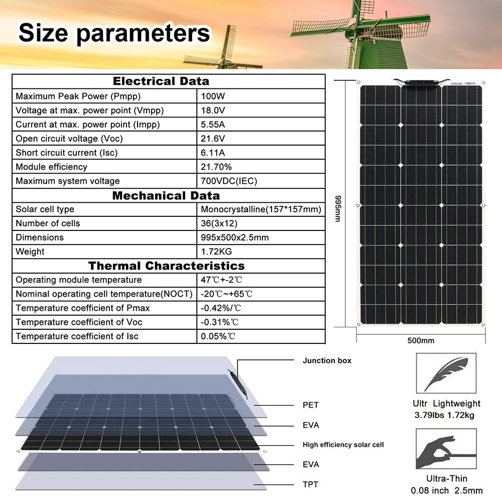 Products Parameters – 100W Flexible Solar Panel Kit: