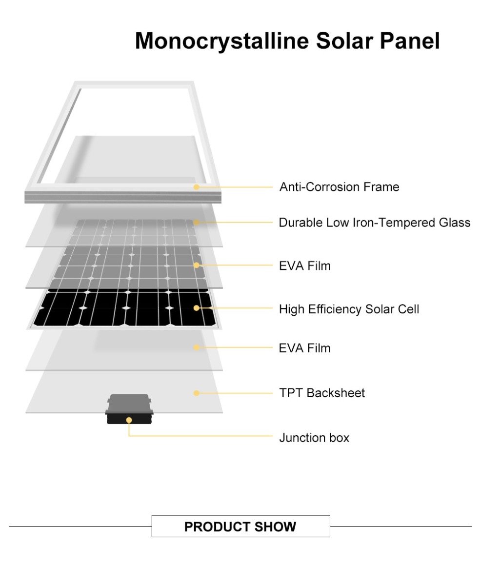 - The corners of this solar panel are equipped with black corner guards, which are used to protect the solar panels.