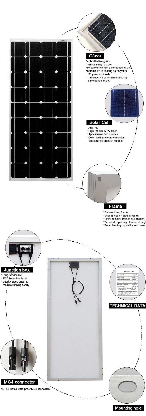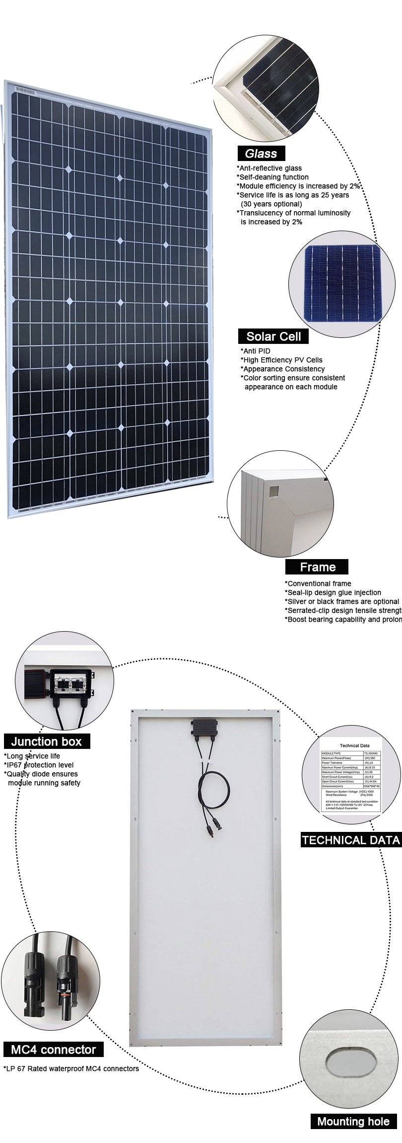 Rigid Solid Temper Glass Solar Panel – 100W, 140W, 200W, 280W Monocrystalline Solar Cells
