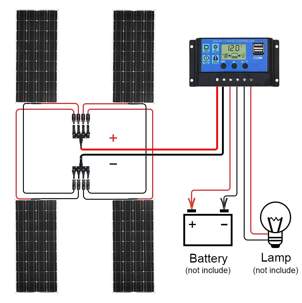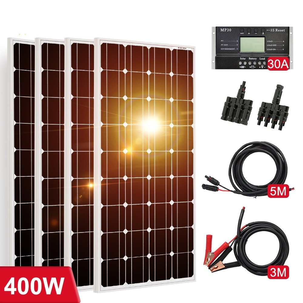 Rigid Waterproof Solar Panel Set with Controller, Cables, Connectors – 18V 100W, 200W, 400W