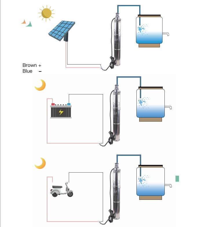 • For example: If the rated power of pump is 200W, then install 300-400W solar panel is workable. If the power of the solar panel is much larger than 2 times the pump power, the pump can still work normally as long as the output voltage of the solar panel is within the safe range.